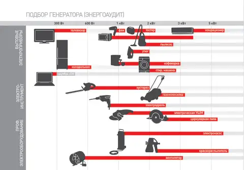 Мощность генератора должна быть выше суммарной мощности подключаемых приборов примерно на 30%. Если нужно 5 кВт, выбирают модель на 6,5 кВт и так далее. Генератор рассчитан на работу в номинальном режиме, поэтому ориентируйтесь именно на этот показатель.