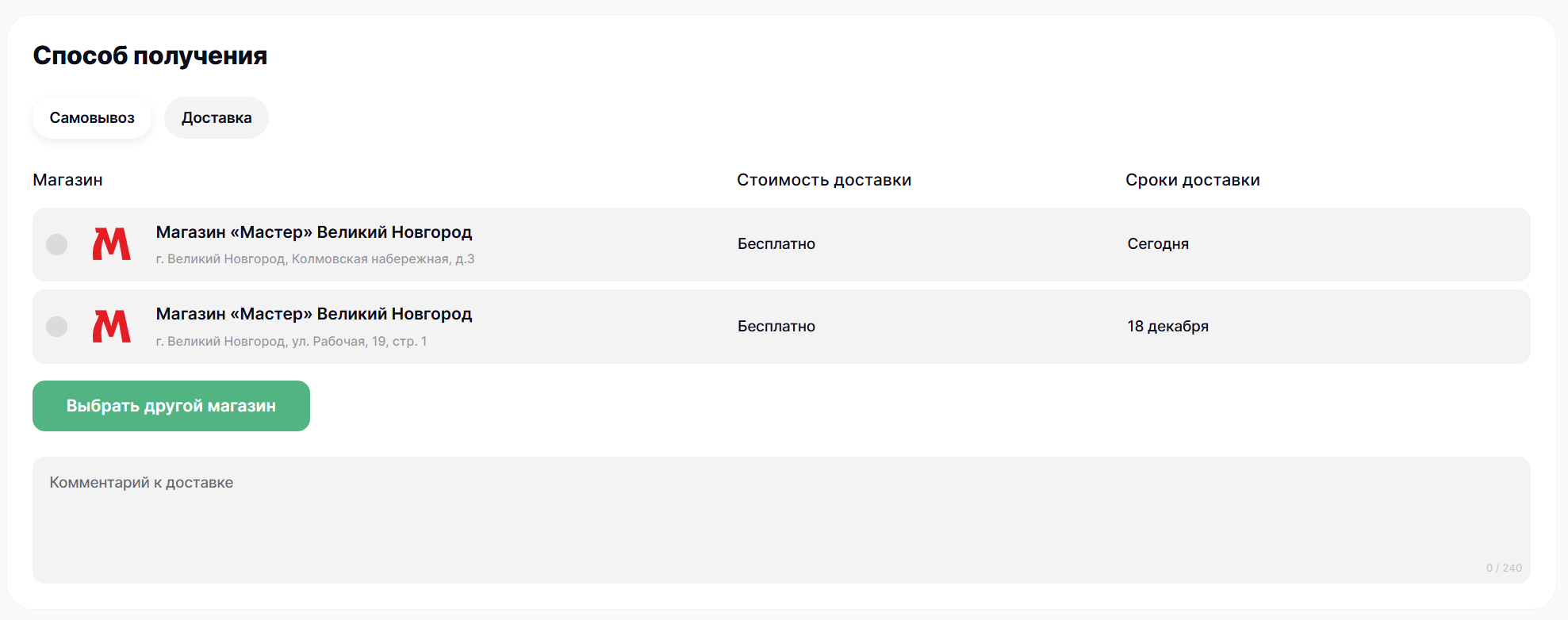 Выберите удобный для вас способ получения товара: самовывоз из розничного магазина/пункта выдачи заказов или курьерскую доставку, с информацией о стоимости доставки вы можете ознакомиться в разделе "Доставка".